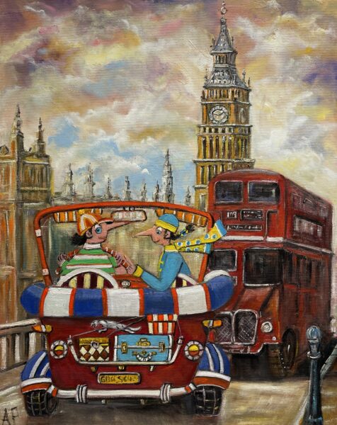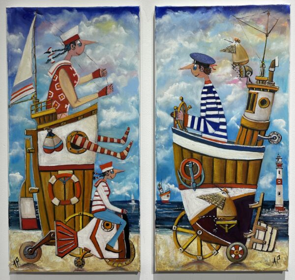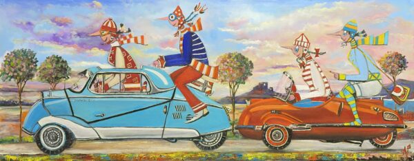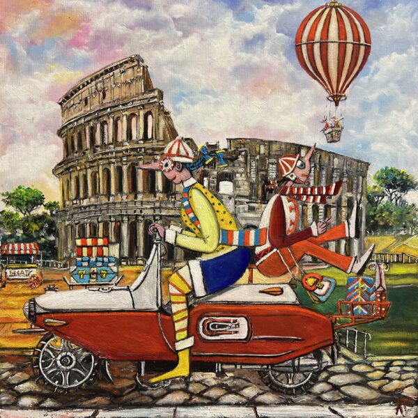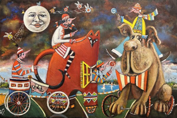Hundreds of paintings and sculptures are in collections all over the world, including USA, New Zealand and even Afghanistan also in all European countries. Currently inspired by ceramic art in a funny way trying to tell about human passions. Behind the fairy-tale decorations are hidden the deepest human passions and desires. Canvas stretched on wooden frame. Colors of the painting may slightly differ from photos due to screen settings.