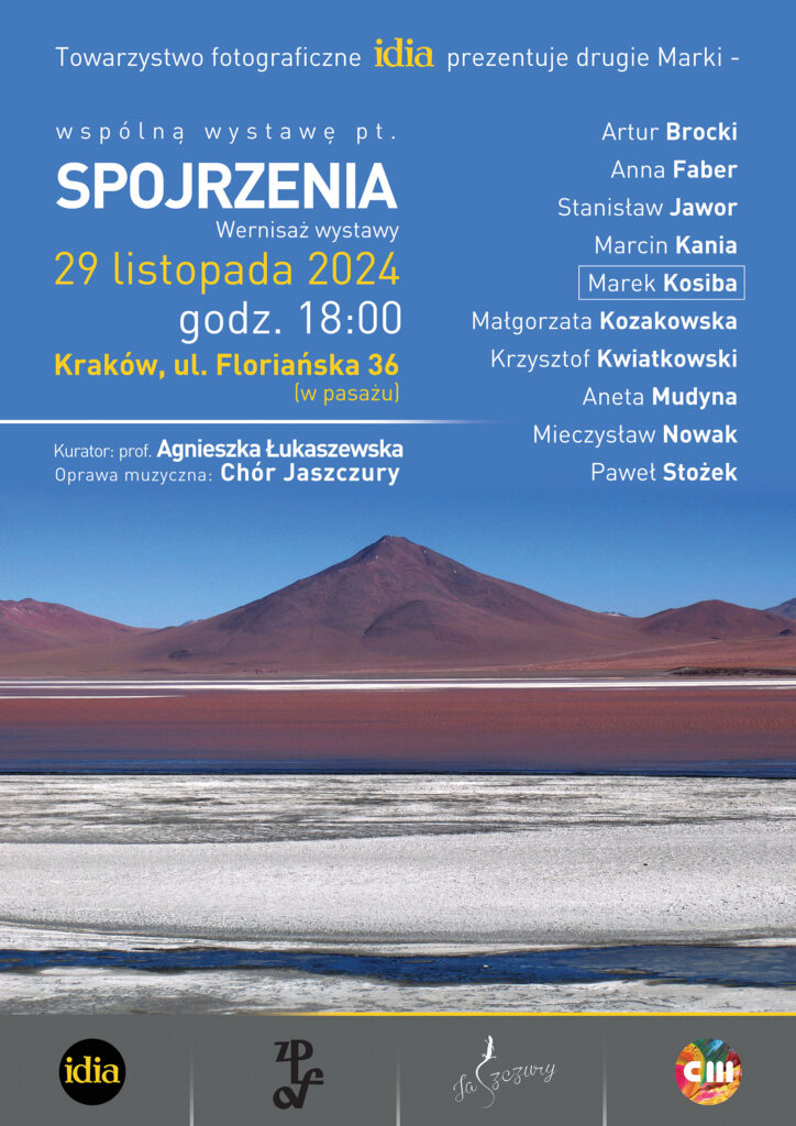 The second edition of the cyclical event of the Idia Photographic Society, the joint exhibition “Spojrzenia”, presents the latest achievements of its members: Artur Brocki, Anna Faber, Stanisław Jawor, Marcin Kania, Małgorzata Kozakowaka, Krzysztof Kwiatkowski, Aneta Mudyna, Mieczysław Nowak and Paweł Stożek.
