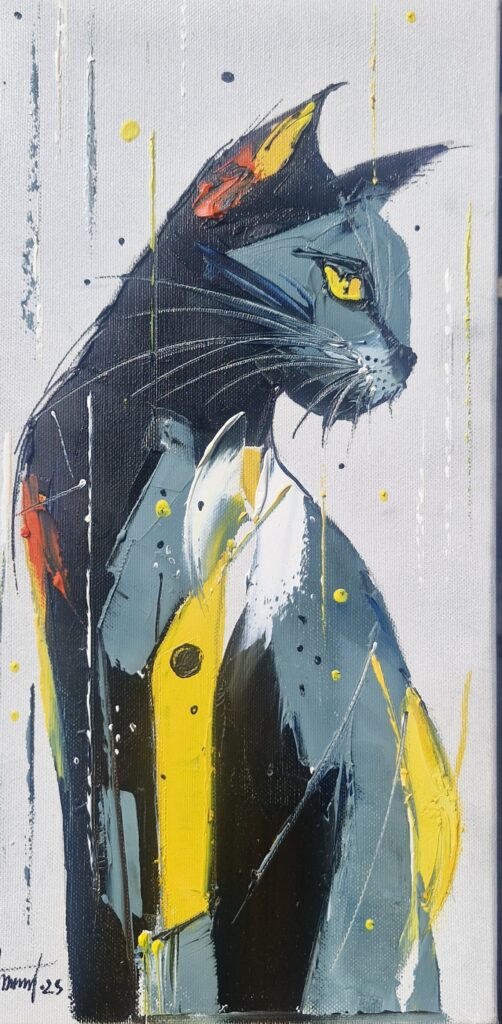 In this intriguing work we encounter a feline presence captured with masterful expression. The cat, painted in striking shades of ochre, deep charcoal, and starlit silver, commands the canvas with an aristocratic elegance. Its eyes, a compelling shade of amber, draw us into a narrative of mystery and introspection. The artist's deft use of bold brushstrokes and textured layers evokes a sense of movement, reminiscent of the fluid elegance seen in the works of modern expressionists.