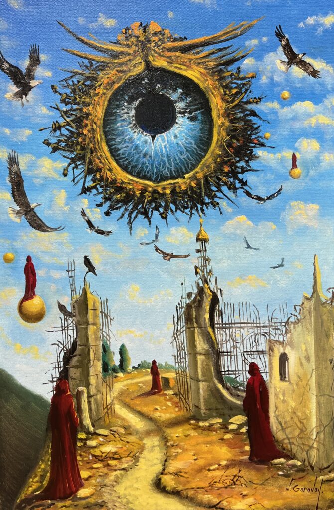 In an enchanting fusion of surrealism and mysticism, this artwork captivates with its grand celestial eye, an omnipotent observer woven into the very fabric of the sky. The azure expanse, dotted with enigmatic spheres and soaring birds, creates a dynamic contrast against the fiery golden aura surrounding the eye. Below, robed figuresβseemingly plucked from the pages of an ancient tomeβwander a labyrinthine path, flanked by crumbling, yet resolute, gates. The artist masterfully balances the ethereal and the tangible, blending warm earth tones with vibrant blues and reds. A dreamlike odyssey unfolds, inviting both contemplation and whimsy, as if Salvador DalΓ had orchestrated a divine spectacle in a forgotten realm.