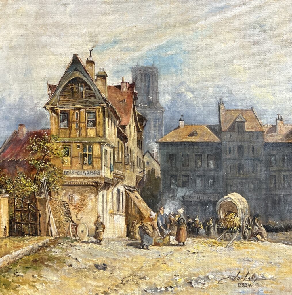 A mesmerizing dance of light and shadow unfolds in this enchanting tableau, where the cobblestones of a quaint village street seem to echo the whispers of bustling townsfolk. With an eye for detail reminiscent of late 19th-century realism, the artist captures the rustic charm of a bygone era, bathed in a palette of earthy ochres and soft blues. The architecture stands proudly, its timber frames telling tales of time, while the townspeople, rendered with gentle brushwork, breathe life into the scene. A horse-drawn cart laden with goods meanders through the foreground, inviting us to join the narrative. There’s a whimsical touch here, a nod perhaps to the Impressionists, where light itself becomes a characterβ€”dancing, flickering, and imbuing the scene with an air of nostalgia.