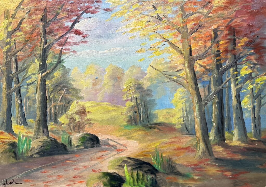 A winding forest path threads through a tapestry of fall foliage, where fiery maples and golden birches arch overhead in a kaleidoscope of color. Soft, diffused light filters through the canopy, illuminating moss-clad stones and a distant sunlit meadow that beckons beyond the trees. Through its gentle brushwork and harmonious palette of warm reds, ambers, and cool lilacs, the painting evokes the serene pleasure of an autumn stroll where every step reveals the quiet poetry of seasonal transition.