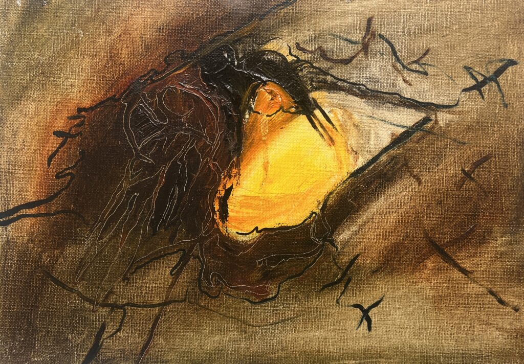 This abstract painting captivates with its raw intensity and dramatic contrast of light and shadow. A glowing golden core emerges from the dark, textured surroundings, evoking themes of transformation, inner energy, or a hidden force breaking through confinement. The expressive, almost chaotic lines surrounding the central light create a sense of movement and tension, suggesting struggle, rebirth, or revelation.