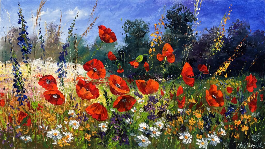 In a symphony of color and flourish, this captivating canvas draws the viewer into a sunlit meadow swirling with the vibrancy of scarlet poppies and the intricate whispers of lavender blues. The artist deftly captures the dance of light and shadow, imbuing the piece with an evocative sense of movement. A nod to Impressionism is evident in the vigorous brushstrokes and play of color, each petal rendered with both precision and a touch of wild abandon. The clear azure sky serves as a serene backdrop, contrasting with the earthy chaos below, lending the scene both depth and a dreamlike tranquility. This painting is a jubilant celebration of nature’s untamed beauty.