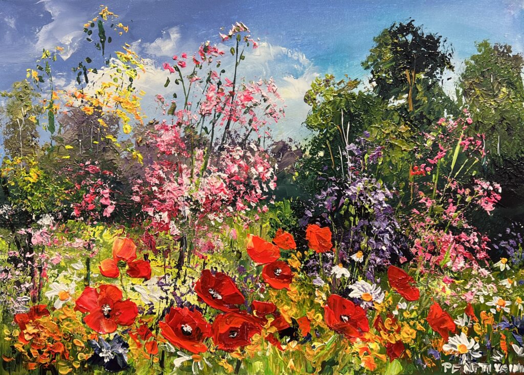 In this vibrant symphony of color, the artist captures the exuberance of a sunlit garden in full bloom. The composition bursts with wildflowers, their reds, pinks, and yellows harmoniously clashing against a backdrop of deep greens. There's a palpable sense of movement, as if a gentle breeze rustles through the petals, caressing each blossom with care.