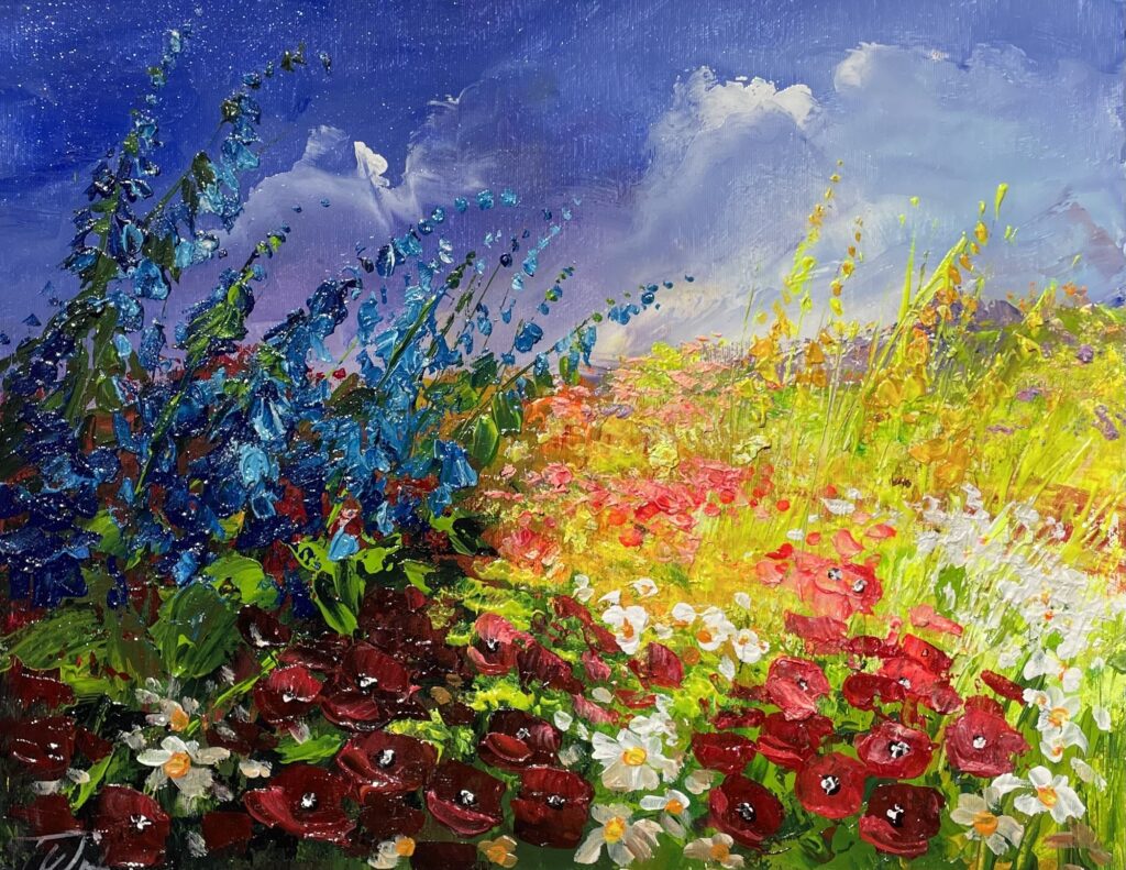 In this vibrant celebration of nature's bountiful splendor, an explosion of colors dances upon the canvas, echoing the spirited brushstrokes of impressionistic maestros. The blue flowers ascend with a rhythmic elegance, swaying gently under the embrace of a sky painted with whispers of lavender and the softest clouds. The vivid reds and whites of the poppies and daisies below create a vivid tapestry, their cheerful hues harmonizing with the sun-drenched fields of gold and green. The artist's masterful use of impasto technique adds a tactile dimension, inviting the viewer to revel in the painting's lush textures and rich contrasts. A joyous ode to the beauty of the natural world.