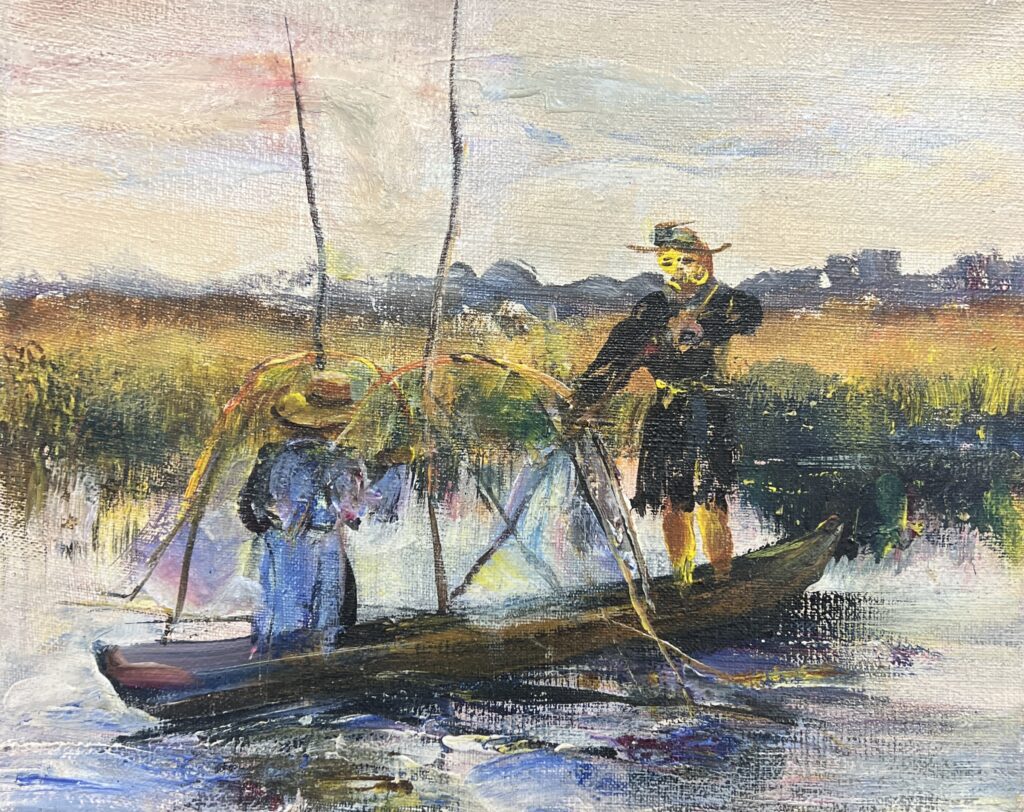 In this enchanting canvas, we encounter a scene that deftly balances whimsy and tranquility. The painting presents two figures in a delicate dance of solitude and companionship as they glide through serene waters in a slender boat. The artist employs a palette of soft pastels and earthy tones, effortlessly capturing the fleeting light of dusk that dances upon the reeds and ripples.