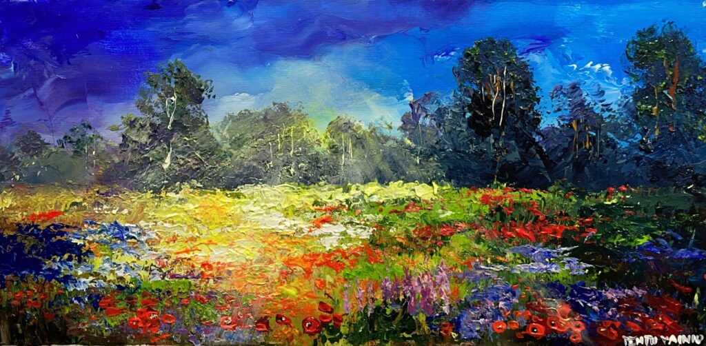 In a vibrant symphony of color and texture, this captivating oil painting bridges the exuberance of Impressionism with the audacity of Post-Impressionist flair. A radiant landscape unfolds, awash with riotous blooms that seem to waltz across the canvas in a lively dance of crimson, violet, and gold. The artist masterfully captures the essence of a sun-drenched meadow under the bold embrace of a cobalt sky, where each tree stands as a sentinel in the distance, their foliage casting whispering shadows.