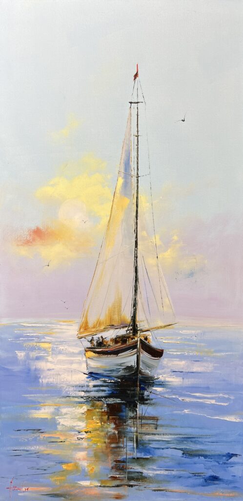 A solitary sailboat glides serenely over the tranquil azure waters, set ablaze by the warm embrace of a sun-kissed horizon. This evocative composition marries the delicate brushstrokes of impressionism with the serene majesty of maritime art. The artist's paletteβa symphony of soft pastels and reflective bluesβinvites the viewer to bask in the harmonious interplay of light and shadow, evoking a sense of tranquil nostalgia.