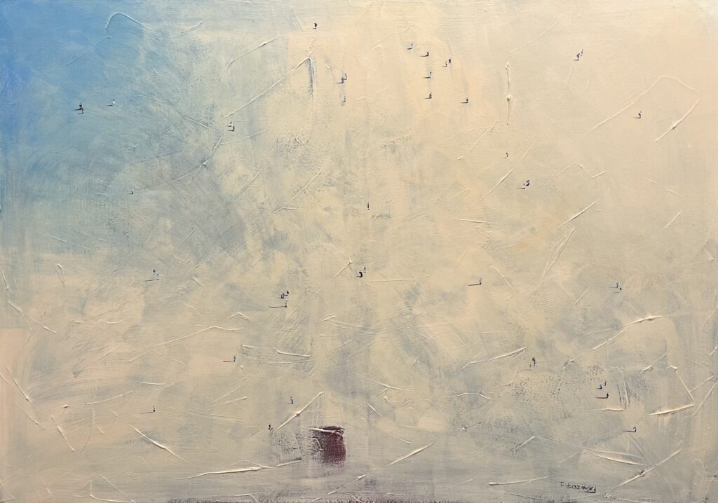 This artwork exudes an airy whisper of minimalism, tantalizing the viewer with its delicate play of texture and hue. The canvas stretches into an ethereal expanse, where subtle shades of blue and beige dance together, reminiscent of a serene dreamscape or the tranquil meeting of sea and sky. Tiny, sporadic figures emerge like distant memories, evoking a lighthearted sense of mystery and whimsy. The artist's masterful use of negative space speaks volumes in silence, inviting introspection with an almost meditative quality. A single, bold red mark anchors the piece, adding a punctuated note of intrigue and contrast. This composition captures a fleeting moment of beauty, subtly flirting with the boundaries of abstraction and reality.