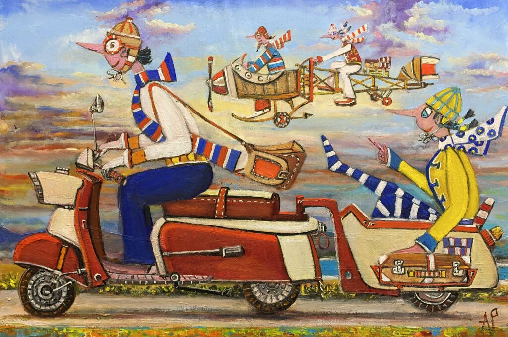 Hundreds of paintings and sculptures are in collections all over the world, including USA, New Zealand and even Afghanistan also in all European countries. Currently inspired by ceramic art in a funny way trying to tell about human passions. Behind the fairy-tale decorations are hidden the deepest human passions and desires. Canvas stretched on wooden frame. Colors of the painting may slightly differ from photos due to screen settings.