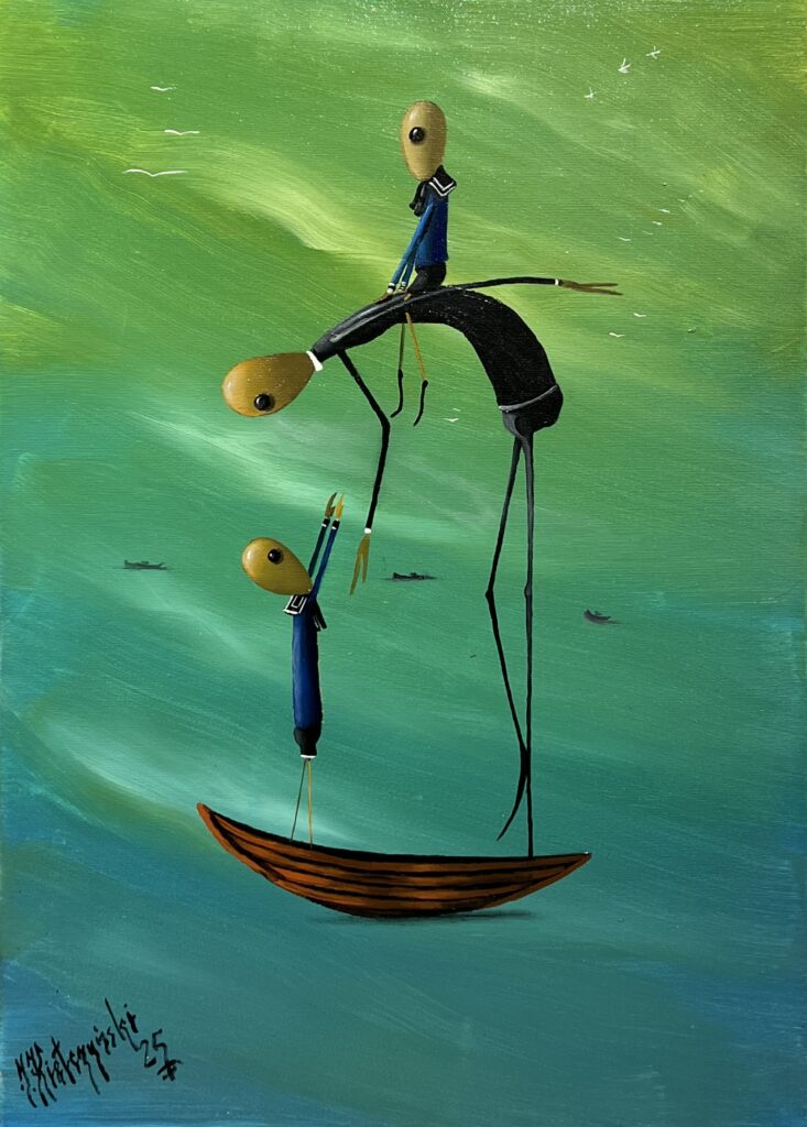 In this whimsical ballet of forms and colors, the artist conjures a surreal tableau that dances between the realms of dream and reality. The figures, elongated and playfully exaggerated, evoke a sense of delicate balance as they hover above an imaginary sea. With a palette dominated by serene greens and deep blues, the painting exudes tranquility, while simultaneously sparking curiosity with its bold strokes and elusive forms. Influences of surrealism are undeniable, as the piece seems to nod to visions of dreamlike narratives. The composition's gentle humor and exquisite tension captivate the viewer, inviting them into a world where anything feels possible.