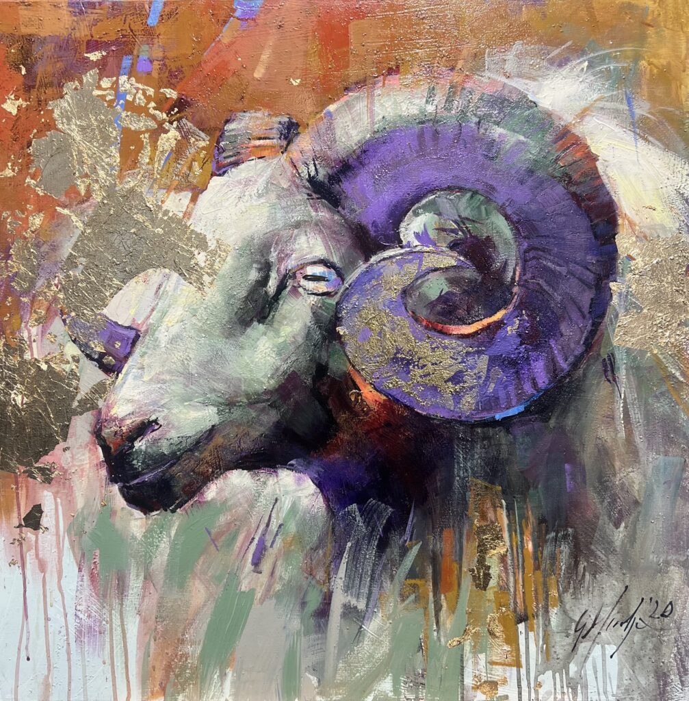 Explore the captivating world of animal art with this Big Horn Aries painting by the talented artist Grażyna Mucha. Created in 2020, this unique piece of art vividly portrays an Aries/Ram with striking violet/purple horns, embodying both power and elegance. The artwork is a beautiful blend of rich, earthy tones, vibrant purples, and luxurious gold accents that bring the majestic ram to life.