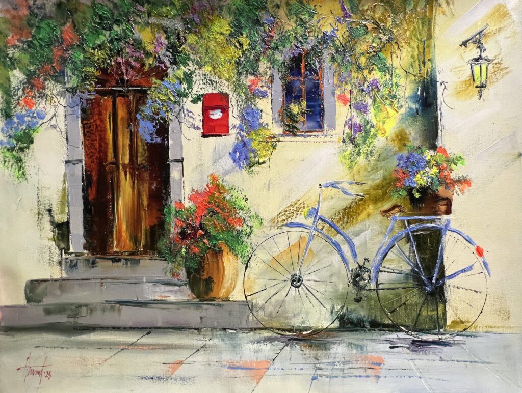 A charming dance of colors and textures unfolds in this beguiling work, as a serene bicycle leans against a sunlit wall adorned with lush foliage. The artist employs a spirited fusion of impressionistic and contemporary techniques, with vibrant, cascading blossoms set against the muted, earthy facade of an inviting entrance. The paletteβan exuberant mix of verdant greens, fiery reds, and tranquil bluesβcreates a vivid symphony that beckons the eye. The play of light and shadow adds a whisper of mystery to the tranquil scene, while the composition subtly guides the gaze from the rustic door to the luminescent window. The delightfully rendered bicycle, with its delicate curvature, suggests an unhurried afternoon within a timeless, Mediterranean idyll.
