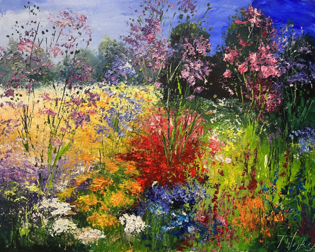 In a symphony of colors and vivacity, this captivating landscape invites viewers into a dance of textures and hues reminiscent of the Impressionist masters. Bold swathes of magenta and azure strike a harmonious balance against the lush tapestry of greens and yellows, while the subtle lavender whispers sweet nothings in the breeze. The artist deftly layers impasto daubs to conjure the very essence of a summer's day, where each stroke pulses with life and spontaneity. The dynamic composition guides the eye through a vivid garden, teasing depth and distance, as if nature itself wished to leap from its painted confines. It is an exuberant celebration of nature's palette—an invitation to embrace joy amid the flowering chaos.