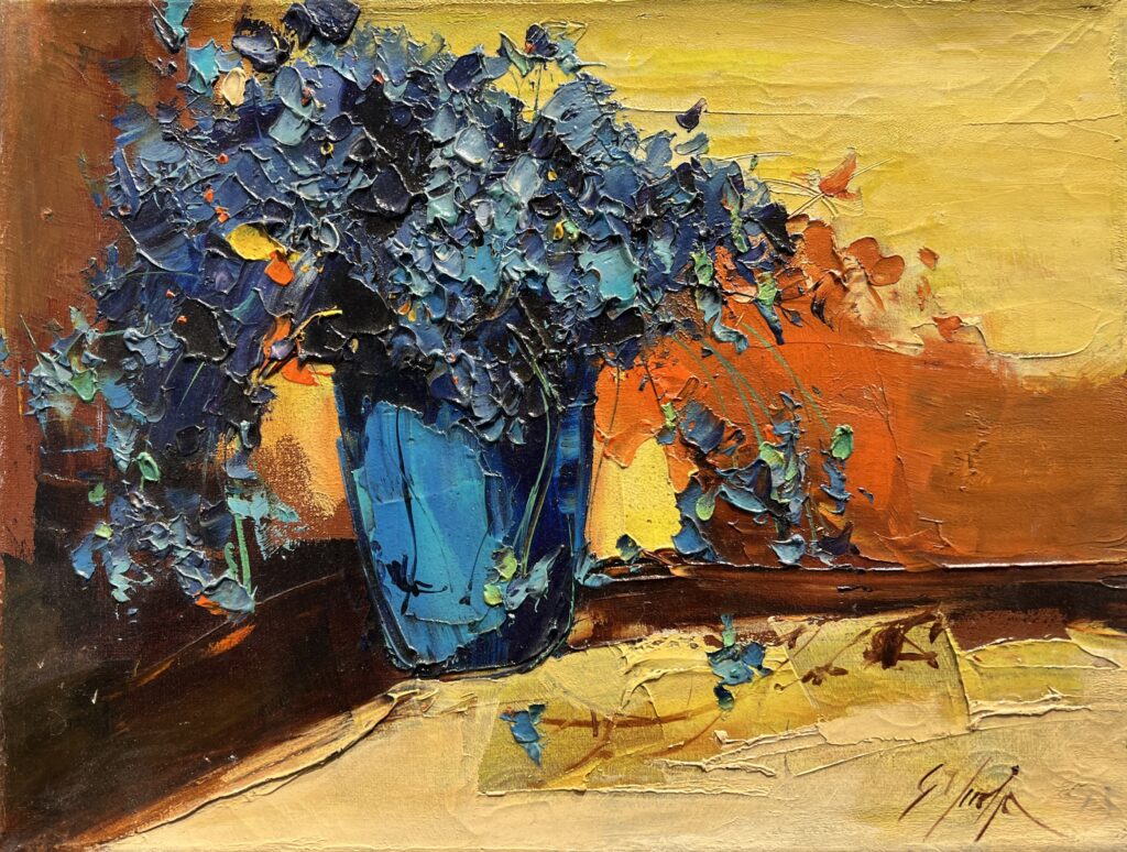 Blue Vase at Sunset is a bold and expressive still life rendered entirely with a palette knife, lending the work a rich, sculptural texture and dramatic energy. The artist layers thick strokes of oil paint to construct a vibrant bouquet of cool blue and turquoise tones, gathered in a striking cobalt vase.
