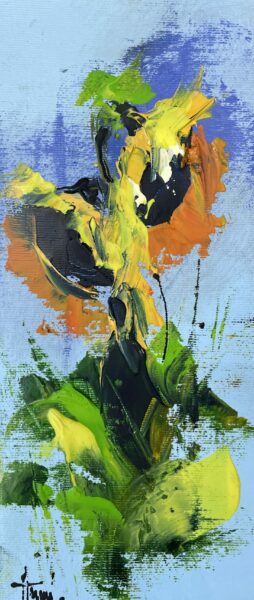 Bursting with vibrant color and texture, this expressive painting presents a lively bouquet of flowers set against a rustic brick wall. The bold palette ranging from electric pinks and blues to sunlit yellows creates a dyamic contrast with the structural background Loose brushstrokes and palette knife work give the composition an energetic, almost abstract quality. The piece celebrates the spontaneity of life and the warmth of everyday beauty through a modern impressionist lens.