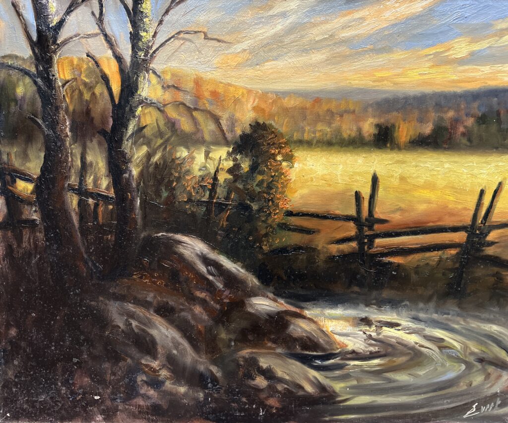 A picturesque symphony of autumnal serenity, this painting captures a moment where nature holds its breath. The artist masterfully juxtaposes the stark, skeletal branches in the foreground against the golden embrace of late afternoon light spilling across the fields. This vibrant interplay of light and shadow invites us into a world reminiscent of pastoral romances, where time seems to stretch luxuriously. The swirling creek at the forefront murmurs in rhythmic tones, caressed by an unseen breeze, suggesting a delicate dance between tranquility and motion. Echoes of the Romanticism movement are evident in the emotive brushstrokes, evoking a profound connection to natureβs ever-changing canvas. The palette, rich in earthy browns and warm yellows, contrasts beautifully with the cool blues of the sky, creating a visual poem that resonates with both wonder and nostalgia.