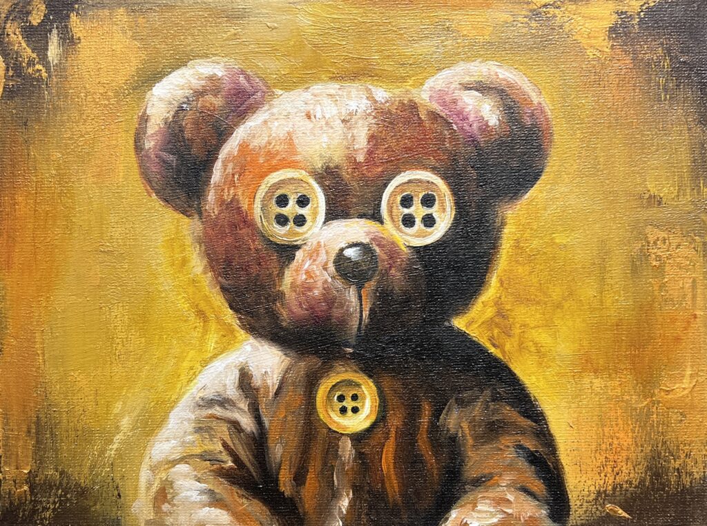 Bathed in a golden glow reminiscent of a vintage sepia photograph, this whimsical teddy bear stands as a nostalgic monument to childhood innocence. With button eyes that hint at a touch of the surreal, the artwork straddles the delicate line between endearing and eerie. The rich, textured brushstrokes evoke a tactile warmth, while the bear's solemn, buttoned demeanor offers a nod to both pop art and surrealism. The background, an abstract interplay of earthy ochres and umbers, provides a dramatic contrast, amplifying the figure's presence. It's a charming yet enigmatic piece that invites introspection with a gentle wink.