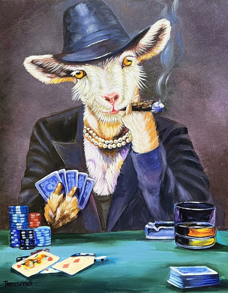 In this audacious tableau, a debonair goat, poised with enviable savoir-faire, smokes a cigar while clutching a hand of cards. Adorned in a snazzy fedora and chic pearls, it’s a whimsical nod to the poker nights of yesteryear. The artist employs rich textures and a masterful palette of earthy ochres and deep blues, imbuing the scene with both humor and sophistication. The vivid contrasts and meticulous brushwork highlight a surreal playfulness reminiscent of pop art with a tinge of the fantastical. This piece invites viewers into a world where the absurd meets elegance, capturing an unforgettable, droll juxtaposition.