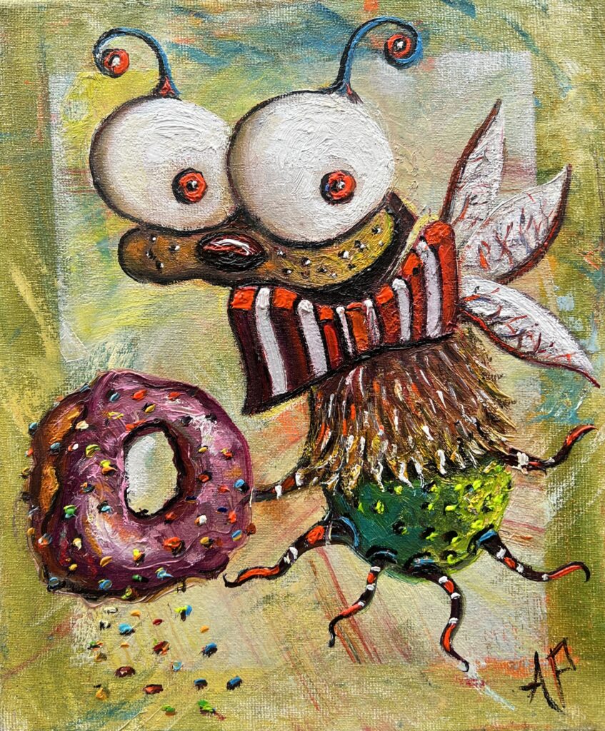 In this whimsical tableau, a delightful collision of surrealism and pop art emerges, revealing a creature with an exuberant personality, as if Salvador DalΓ­ visited a candy shop. The artist summons a playful vibrancy with a palette both riotous and sophisticatedβ€”emerald greens, candy pinks, and sunset yellows create a landscape that dances with texture and imagination. The subject, an eccentric fusion of insect and confection, sports spiraled antennae and whimsical eyes, hinting at a universe where logic complies with caprice. The bold strokes and dynamic composition contribute to a sense of delightful anarchy. This piece is a jovial nod to absurdity, evoking smiles and pondering where the line between fantasy and reality blurs.