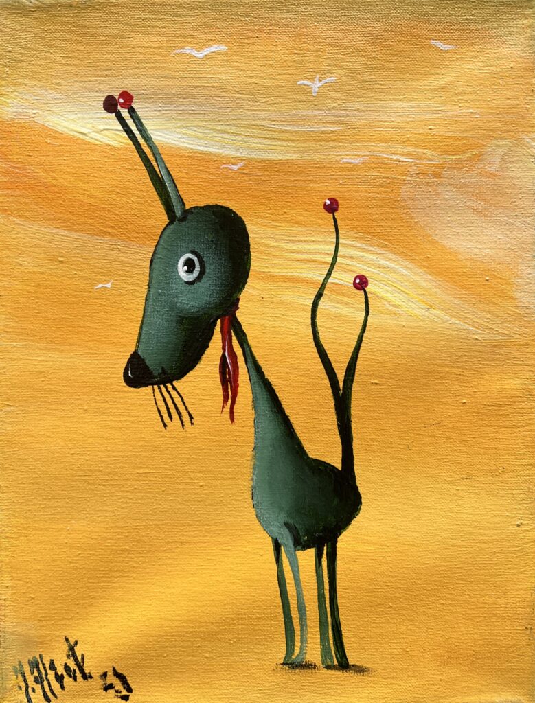 In this delightful canvas, an enigmatic creature stands against a vibrant orange sky, reminiscent of a surrealist theater where dreams waltz with whimsy. The artist employs a playful palette, with deep greens contrasting warmly against the fiery backdrop, conjuring both intrigue and amusement. The creature, seemingly plucked from a child’s vivid imagination, sports elongated antennae tipped with bright red globes, giving it a charmingly alien allure. Its wide, expressive eye peers with curiosity, blending an air of innocence with the absurd. The brushwork is both fluid and deliberate, creating a dynamic sense of movement in a still scene. This piece dances elegantly on the boundary between fantasy and reality, offering viewers an irresistible invitation to ponder and smile.