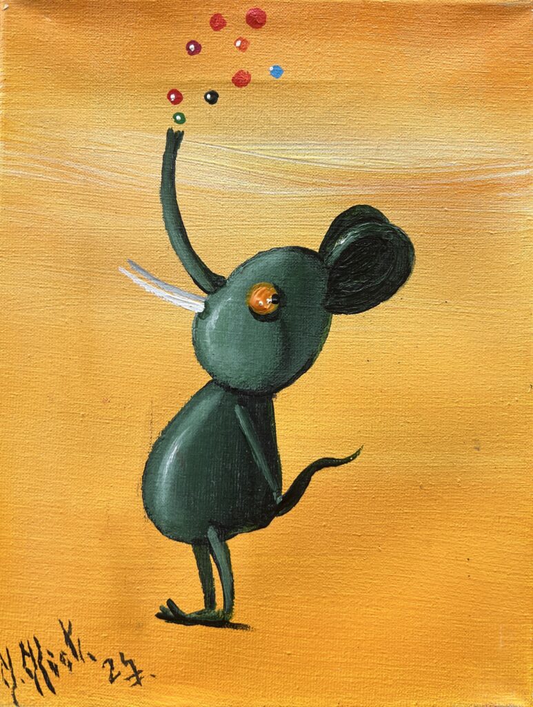 Set against a radiant expanse of golden hues, this delightful canvas captures an enchanting moment of whimsy. The protagonist, a charmingly abstract creature, balances playfulness and poise, juggling a constellation of vibrant orbs that seem to dance in mid-air. With each color—crimson, azure, and emerald—meticulously applied, there's a nod to the vibrant expressiveness reminiscent of fauvism, yet the simplicity invites a touch of surrealist magic. The fluidity of brushwork and the subtle contrast between the deep green form and its sunlit background create a striking equilibrium. This artwork, with its joyful exuberance, offers not just a visual feast but a spark of pure imagination, delightfully daring us to dream.