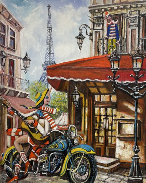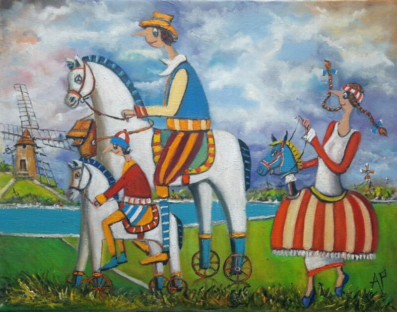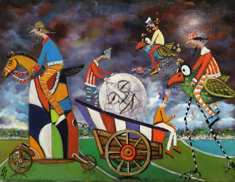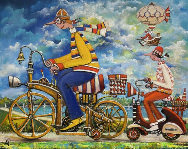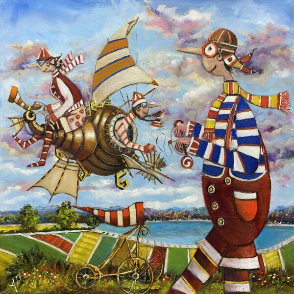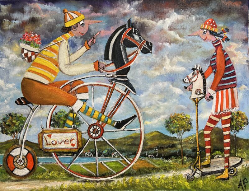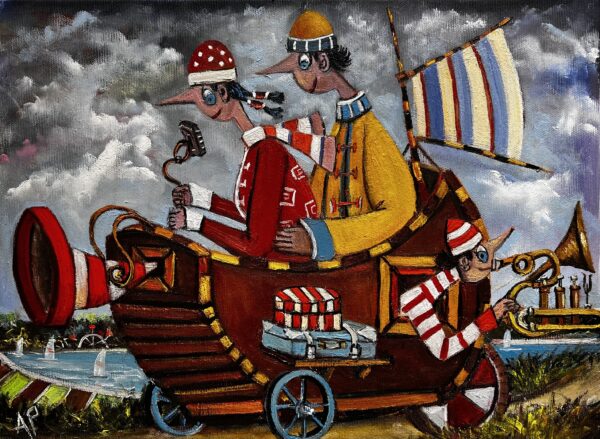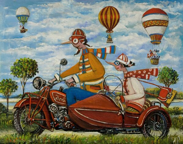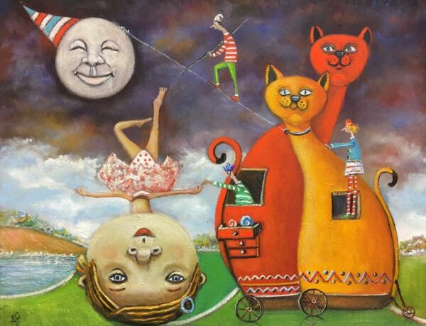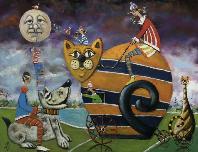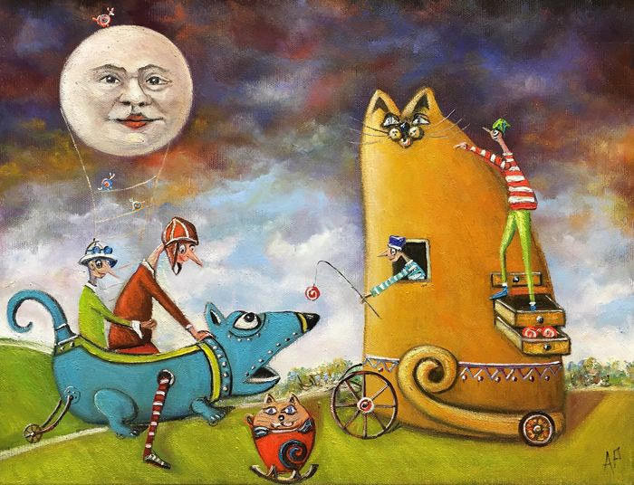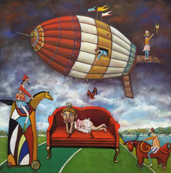 Hundreds of paintings and sculptures are in collections all over the world, including USA, New Zealand and even Afghanistan also in all European countries. Currently inspired by ceramic art in a funny way trying to tell about human passions. Behind the fairy-tale decorations are hidden the deepest human passions and desires. Canvas stretched on wooden frame. Colors of the painting may slightly differ from photos due to screen settings.