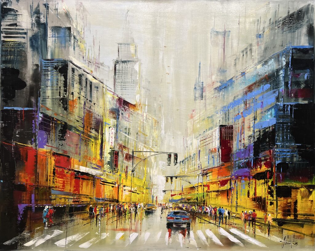 A vibrant urban symphony unfolds before us, invoking the unmistakable energy of a bustling metropolis. This masterpiece, with its dynamic play of colors and textures, captures the viewer in a dance of abstraction and realism. The eye is immediately drawn to the kaleidoscopic facade of towering skyscrapers, where vivid tones of yellow, red, and blue brilliantly contrast against the muted, misty skyline. The artistβs deft use of perspective creates depth, guiding us through the bustling streets alive with the movement of faceless figures and sleek cars. Echoing the impressionistic influences, this scene pulsates with life and vigor, inviting the observer to lose themselves in its hypnotic allure. A true testament to modern urban artistry.