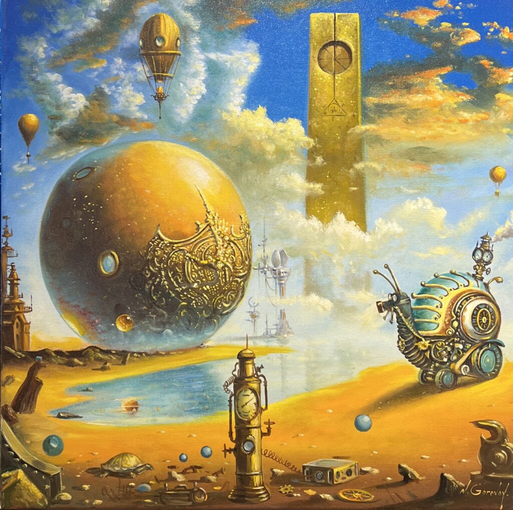 In a whimsical dance between the surreal and the fantastical, this captivating tableau marries the flamboyance of steampunk with echoes of Magritteβs dreamscape. The celestial orb, adorned with intricate golden patterns, seems to hover with an ethereal majesty amidst a vibrant azure sky, where dirigibles float like whimsical thoughts in a feverish dream.