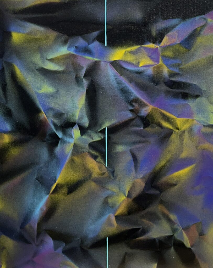 In this captivating piece, the viewer is drawn into a dynamic interplay of color and form that whispers of both chaos and calm. The artist masterfully employs a palette of deep blues, purples, and ochres, evoking the mysterious allure of a cosmic landscape. The composition is a bold exploration of texture, where folds and creases create a sense of depth and dimension reminiscent of crumpled silk or the folds of an unseen mountain range. A slender, vertical line of turquoise slices through the tumult, introducing a serene yet provocative contrast that anchors the eye. This work elegantly balances the abstract with the tactile, inviting one to ponder the boundaries of abstraction. The mood is both meditative and electrifying, a silent dance between light and shadow, hinting ever so subtly at the influences of abstract expressionism.