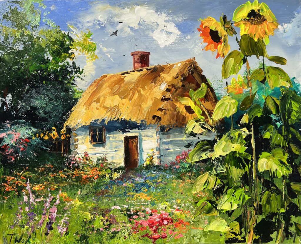 https://www.ahg36.com/modern-art-painting/cottage-with-sunflowers-by-artist-wojtkowski-tadeusz-43235/
