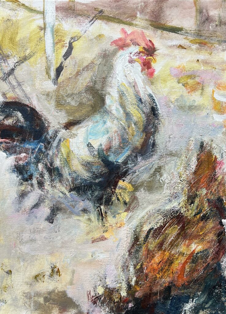 In this mesmerizing tableau, a regal rooster struts with unrepentant aplomb, capturing the essence of pastoral life through a prism of evocative brushwork and vibrant color play. The artist employs a loosely impressionistic style, where the boundaries between form and abstraction are deliciously blurred. With a palette dominated by earthy browns and ochres interspersed with bold splashes of crimson and azure, the piece achieves a captivating depth and dynamism.