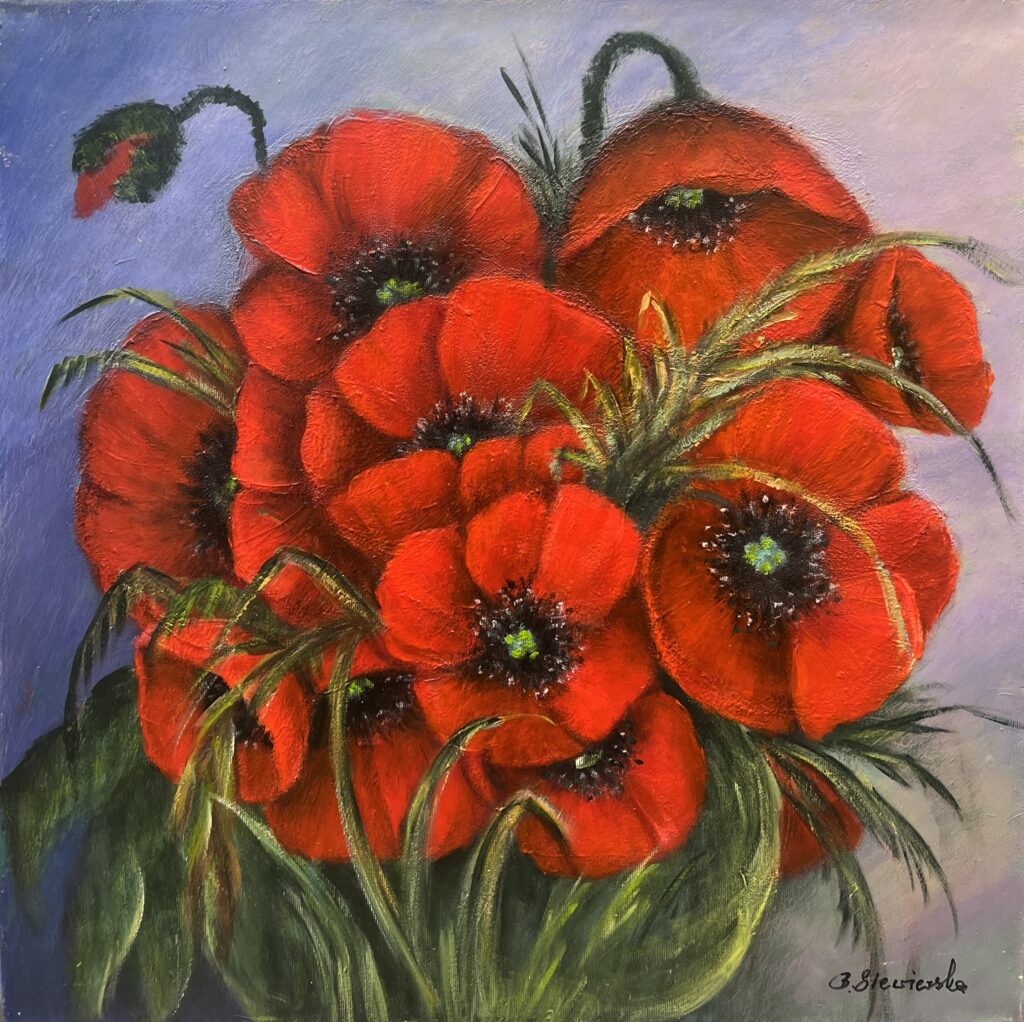A bold bouquet of scarlet poppies unfurls against a soft lavender-gray ground, each velvet petal rendered with tactile richness and vibrant intensity. The flowersβ dark, speckled centers anchor the composition, while wisps of grass-like foliage weave through the blooms, lending a sense of graceful movement. Through its dynamic interplay of color and texture, the painting elevates a simple floral motif into a poetic celebration of lifeβs fleeting brilliance.