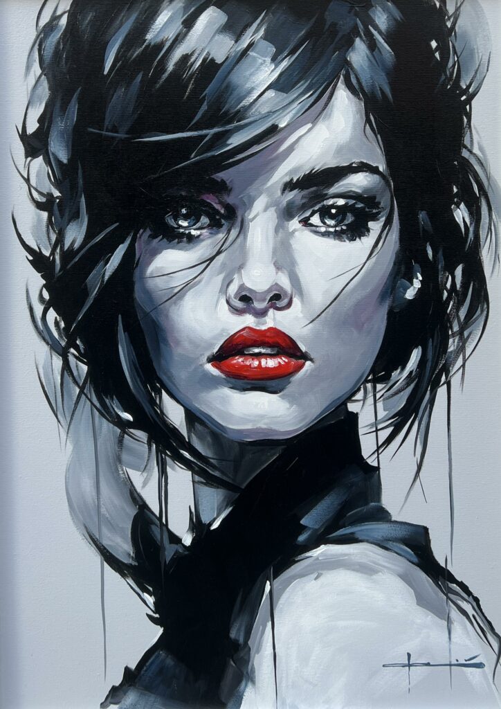 In this striking portrait, one encounters a fusion of modern dynamism and classic allure, reminiscent of film noir's enigmatic heroines. The artist deftly wields a monochromatic palette, punctuated by a provocatively vivid crimson for the lips, creating an irresistible focal point that draws the gaze with magnetic intensity. The brushwork, bold and fluid, encapsulates movement and emotion, while the play of light and shadow adds depth, suggesting a narrative yet untold. The subject's piercing eyes, framed by cascading locks, exude an air of mysteryβinviting speculation upon her thoughts and emotions. This work, pulsating with an urban edge, channels influences from both pop art and expressionism, commanding attention in any distinguished collection.