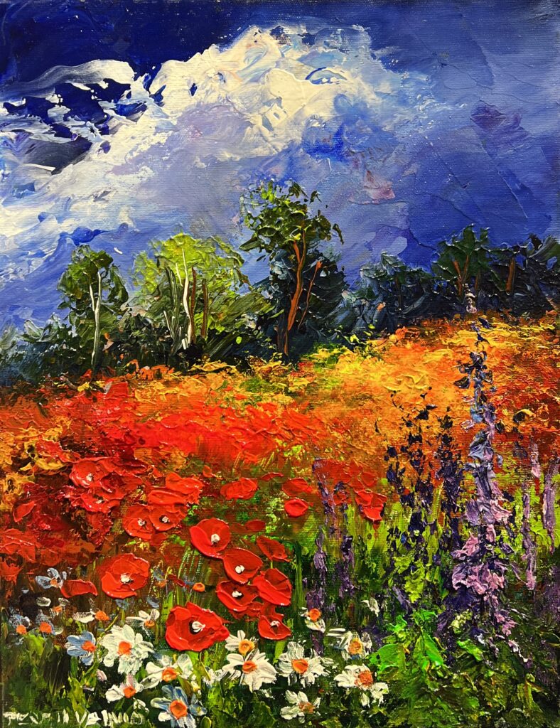 In this boldly atmospheric composition, the land becomes an emotional landscape a sensory experience rather than a geographic one. The fiery reds and oranges of the foreground flowers transition into the golden yellows and deep greens of the meadow beyond, culminating in a tree line rendered with thick, gestural confidence. Above, a sky roils with movement and drama, invoking the ever-shifting moods of nature.