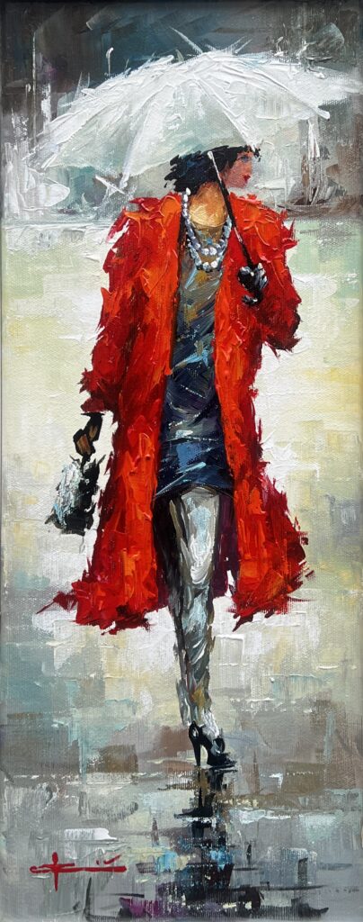 In this captivating piece, a dynamic figure strides through a rain-kissed cityscape, her vibrant red coat in stark contrast to the muted grey surroundings. The artist employs bold, impressionistic brushstrokes to create a sense of movement and spontaneity, capturing the fleeting nature of a rainy day encounter. The white umbrella, almost ethereal in texture, shelters the figure, adding a touch of mystery and elegance to her silhouette.