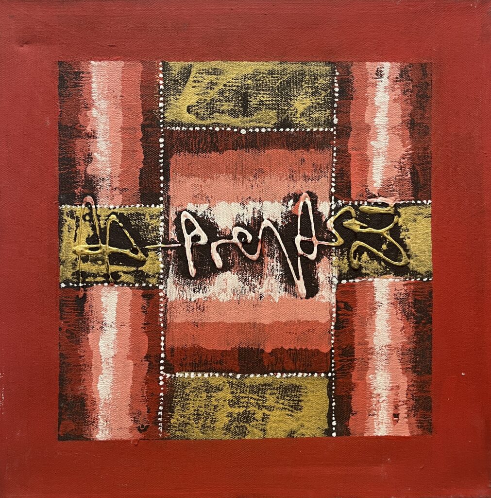 In this striking mixed-media panel, a deep red ground frames a central patchwork of warm terracotta and golden ochre bands, their textured surfaces recalling richly woven textiles. A sinuous, calligraphic stroke in pale pink and metallic gold arcs across the core, injecting an energetic flourish that bridges the geometric rigor of the composition with spontaneous gesture. Through the interplay of bold color, pattern, and tactile relief, the work evokes both the heritage of ornamental craft and the dynamic pulse of contemporary abstraction.