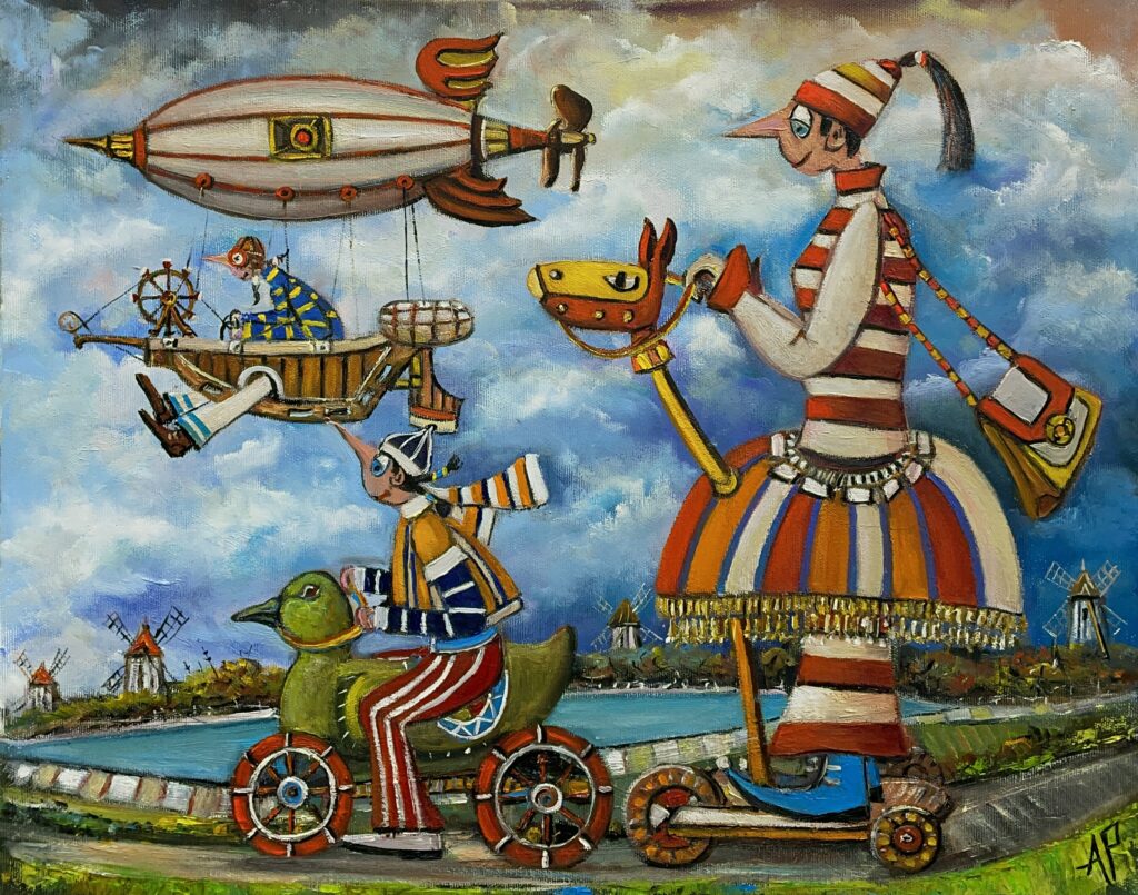 Hundreds of paintings and sculptures are in collections all over the world, including USA, New Zealand and even Afghanistan also in all European countries. Currently inspired by ceramic art in a funny way trying to tell about human passions. Behind the fairy-tale decorations are hidden the deepest human passions and desires. Canvas stretched on wooden frame. Colors of the painting may slightly differ from photos due to screen settings.