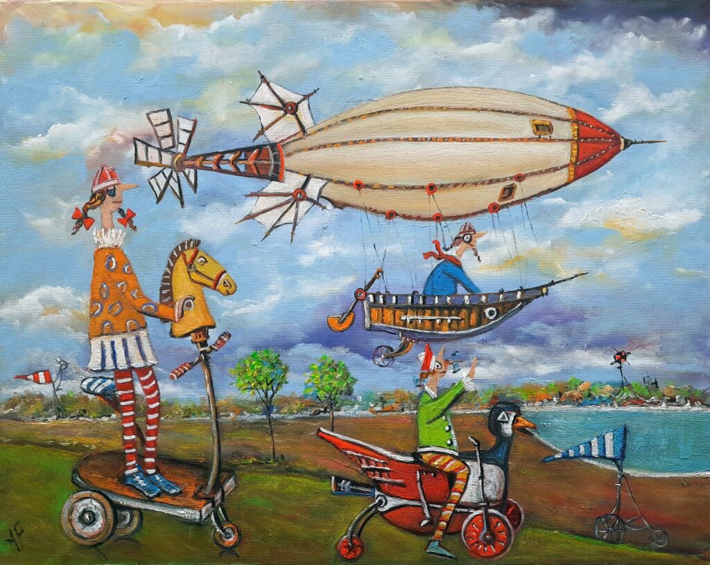 Hundreds of paintings and sculptures are in collections all over the world, including USA, New Zealand and even Afghanistan also in all European countries. Currently inspired by ceramic art in a funny way trying to tell about human passions. Behind the fairy-tale decorations are hidden the deepest human passions and desires. Canvas stretched on wooden frame. Colors of the painting may slightly differ from photos due to screen settings.