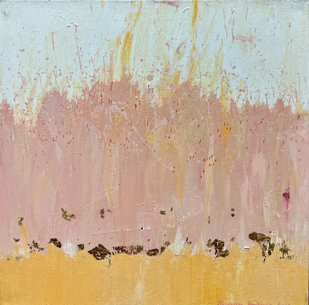 Soft washes of pale cerulean and blush pink rise like morning light above a warm ochre horizon, their textured surfaces enlivened by delicate drips and flecks of gold leaf. The paintingβs gentle gradation evokes the hushed transition from night to day, while the tactile impasto and subtle red accents suggest the lingering echo of dreams. Through its harmonious interplay of color and material, the work invites a moment of quiet reverence at the threshold of awakening.