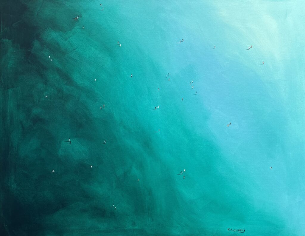 In this mesmerizing tableau, vibrant turquoise waters stretch across the canvas, an evocative dance between serenity and subtle motion. Tiny figures, seemingly adrift, punctuate the expansive aquamarine abyss, offering a delightful wink to humanity's perennial dance with nature. The artist masterfully combines the immersive depth of abstract expressionism with the serene minimalism of modern landscapes, creating an atmosphere that is both contemplative and refreshingly playful.