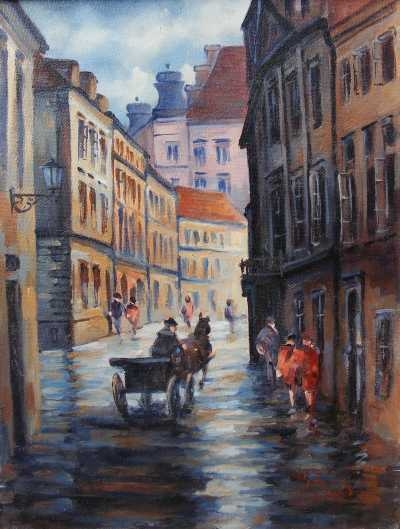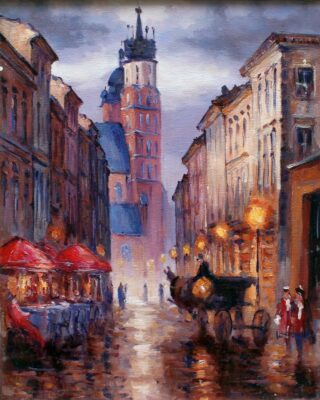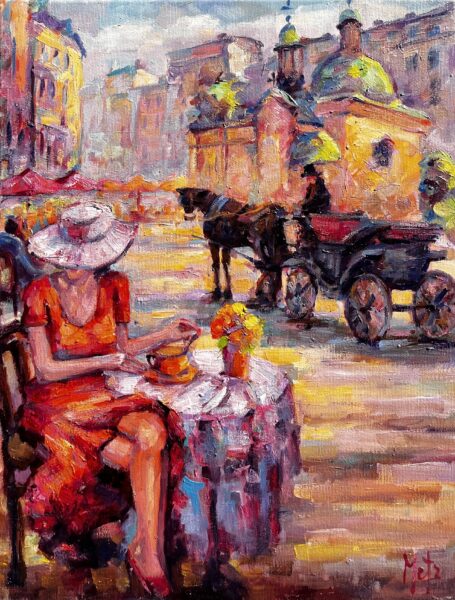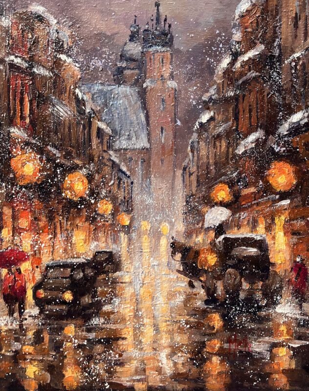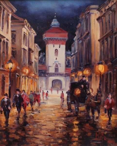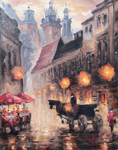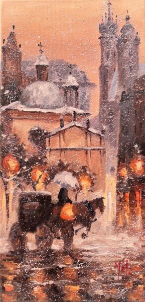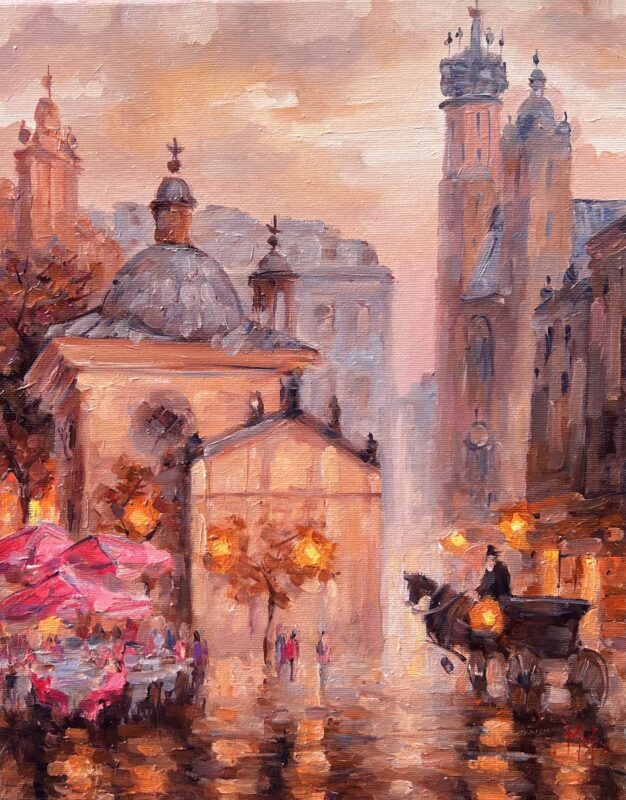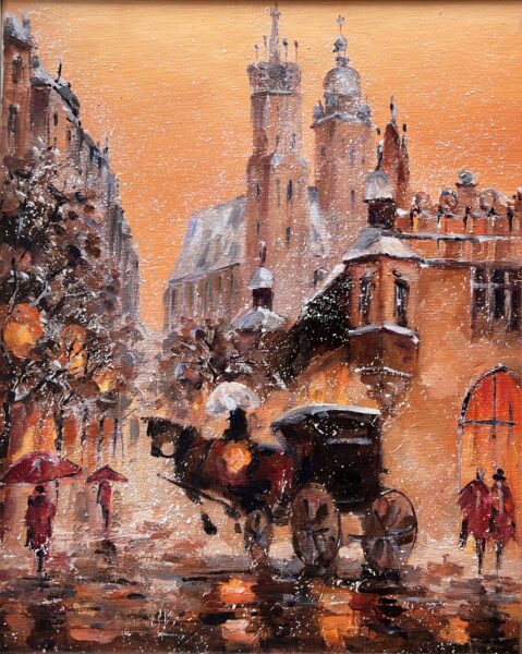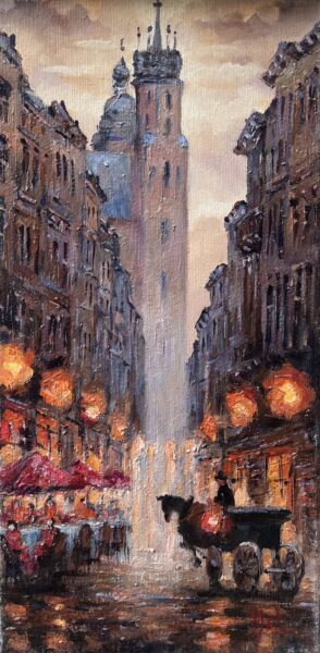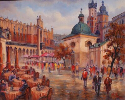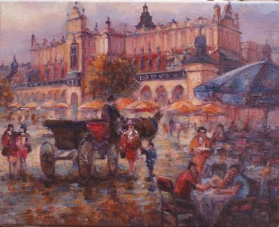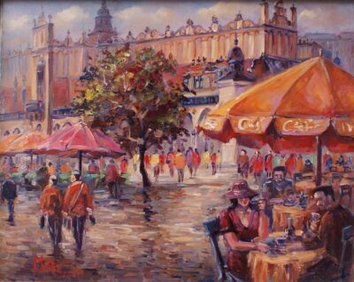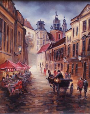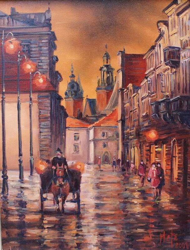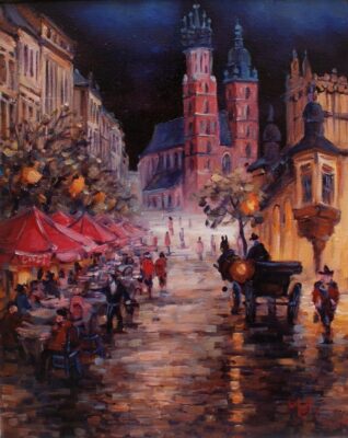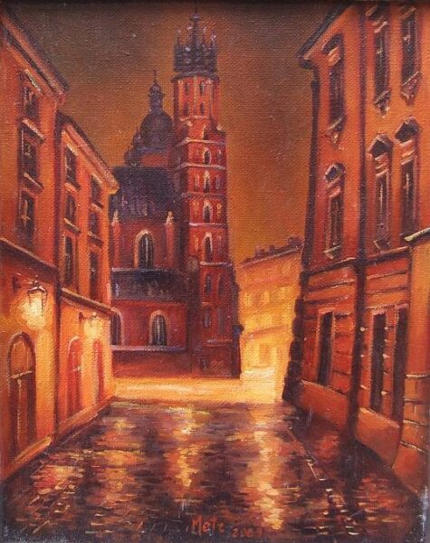 Leszek Metz maluje architekture Krakowa i sceny rodzajowe oraz postacie kobiet.