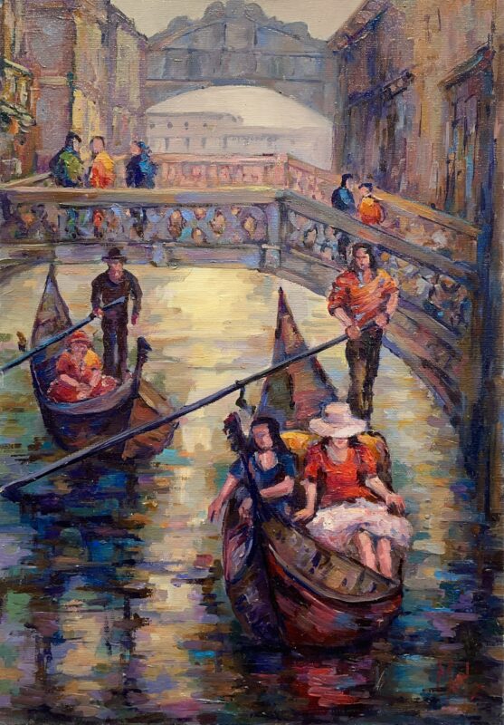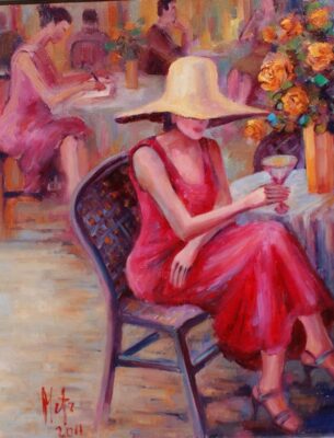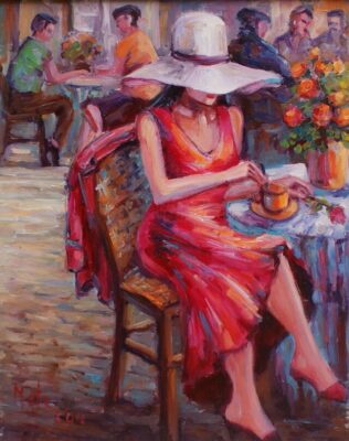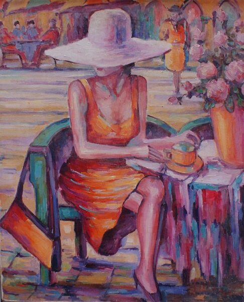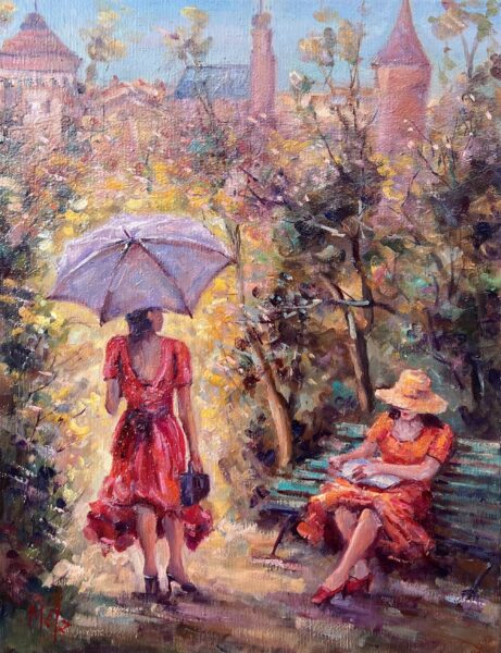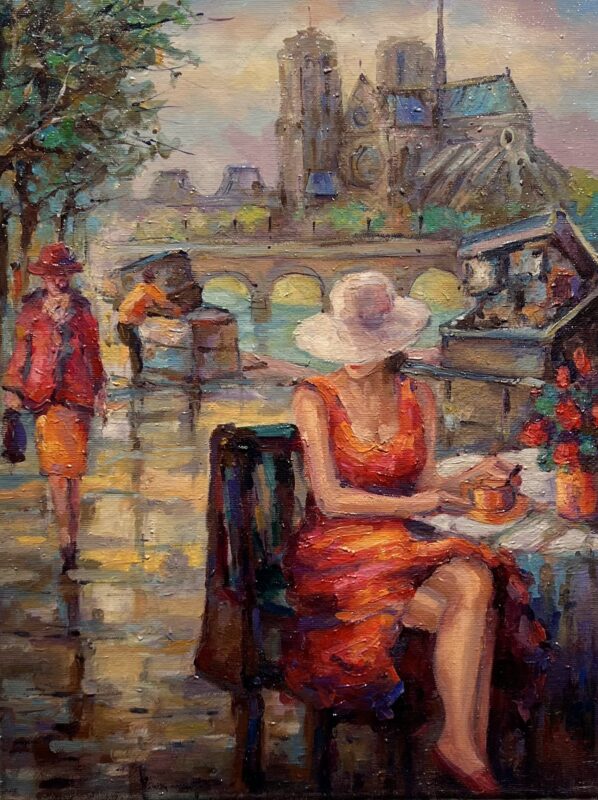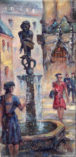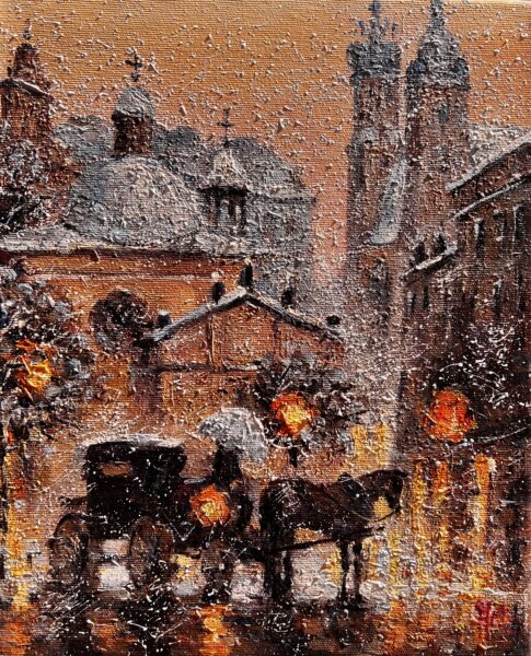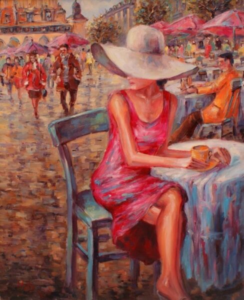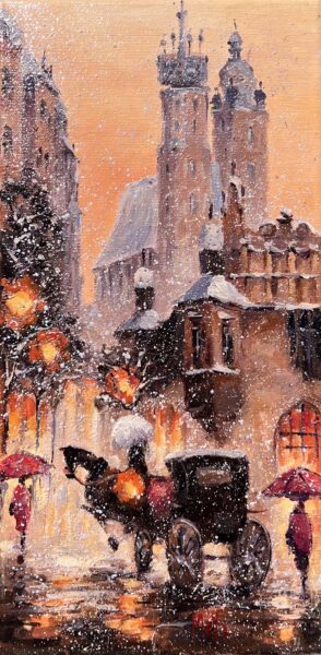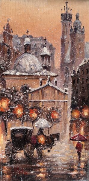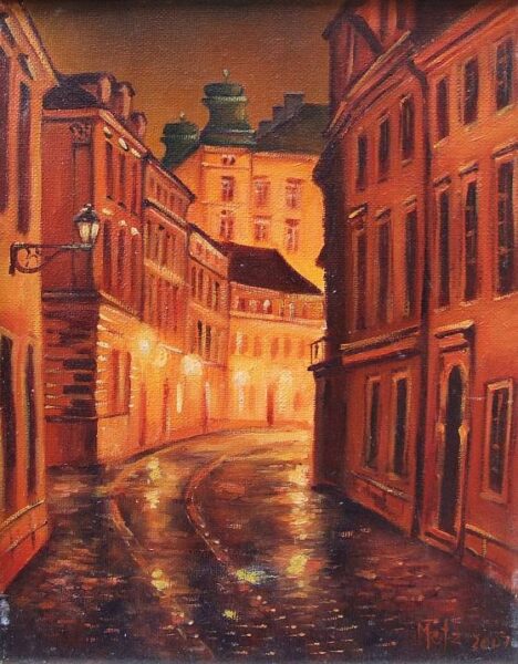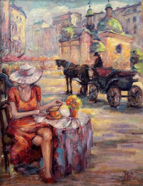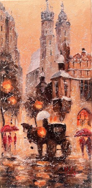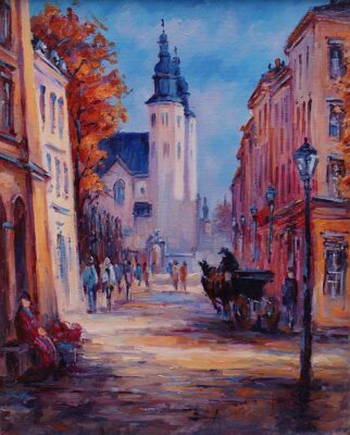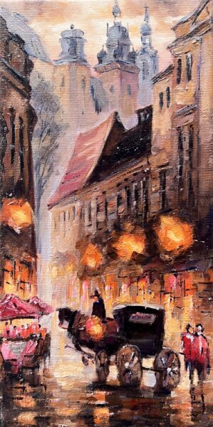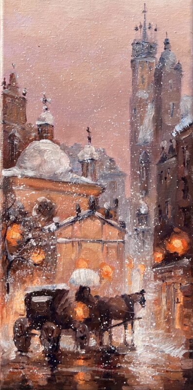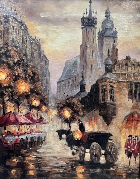 Leszek Metz maluje architekture Krakowa i sceny rodzajowe oraz postacie kobiet.