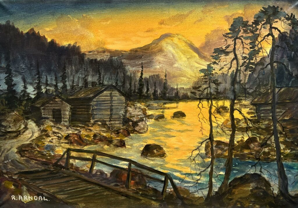 In this captivating tableau, R. Arndal masterfully transports us to a secluded riverside enclave, where rustic cabins nestle against the tranquil embrace of an amber sunset. The scene, suffused with a nostalgic warmth, echoes the tonal elegance of late Romantic landscapes, inviting a sense of serene contemplation. The artistβs deft use of color mesmerizes; golden hues play tenderly across the waterβs surface, in contrast with the deepening blues and greens of the encircling forest. Arndalβs skillful brushwork captures a moment frozen in time, with the gentle bend of trees framing the composition, urging the onlooker to wander farther into this wistful dreamscape. It's as if nature herself pauses, breath baited, awaiting nightβs gentle embrace.