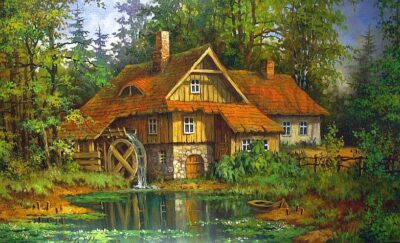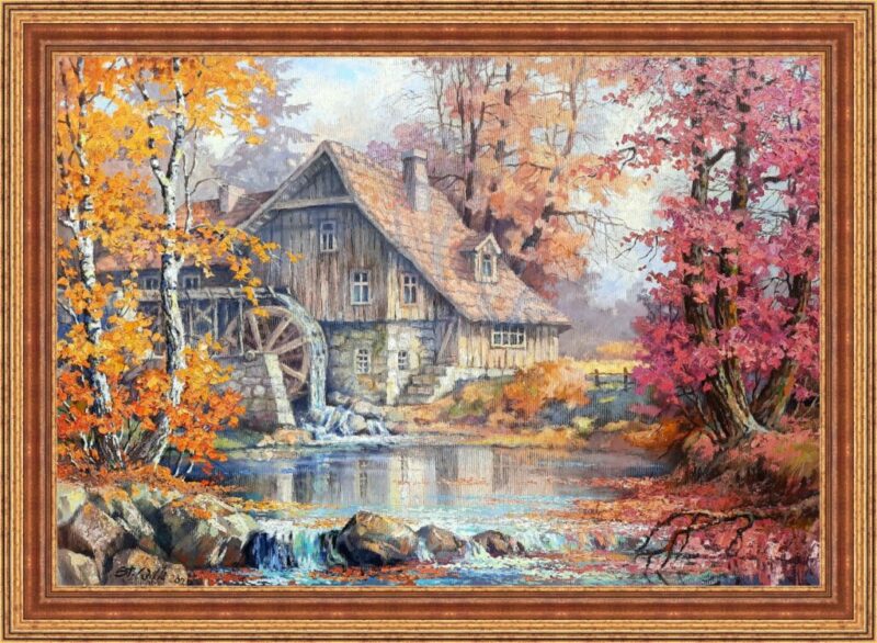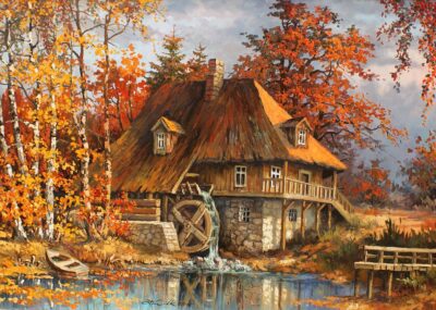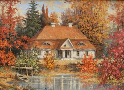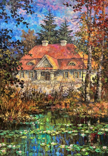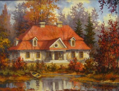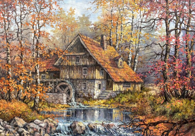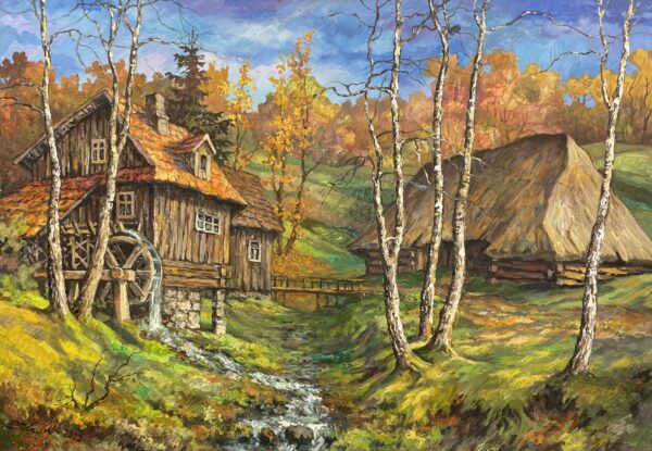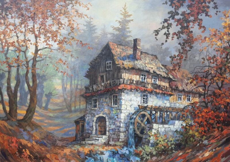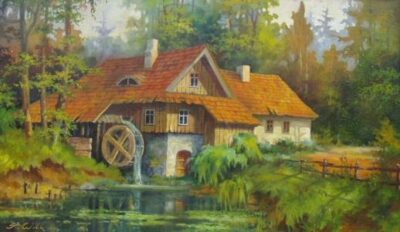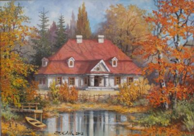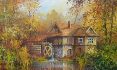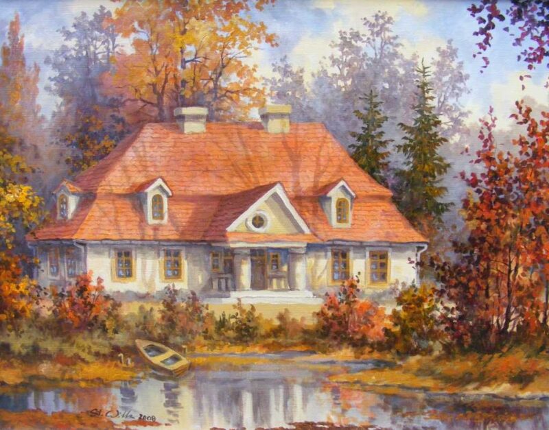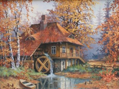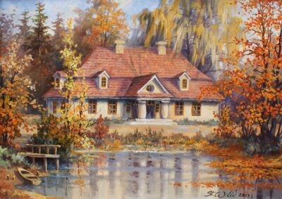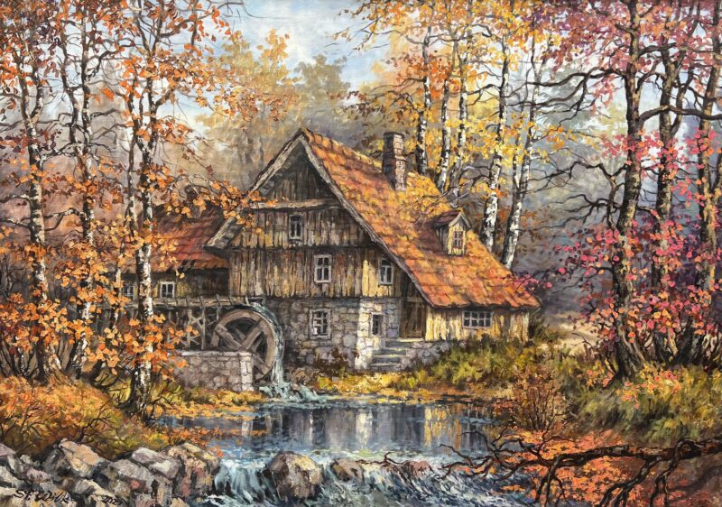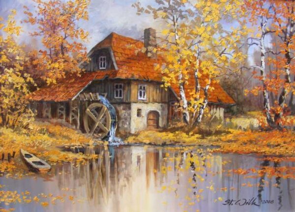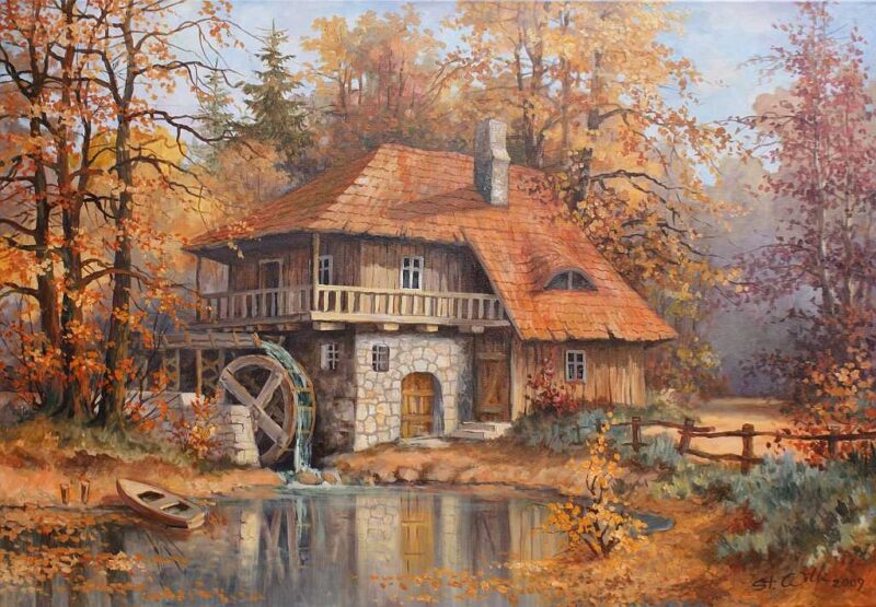 StanisΕaw Wilk maluje pejzaΕΌe, jego ulubiony motyw to staropolskie dworki i mΕyny wodne.
