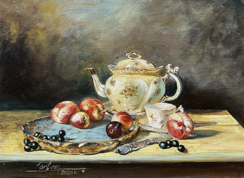 In this charming still life, the artist orchestrates a vibrant symphony of domestic bliss, where Baroque opulence meets rustic elegance. The central porcelain teapot, with its delicate floral motifs, steals the spotlight, its golden accents whispering tales of bygone eras. Nestled around it, a cavalcade of ripe, blushing apples and lustrous blackberries rest on a rustic, weathered plate, each fruit lovingly detailed as if plucked from the very bough of Eden.