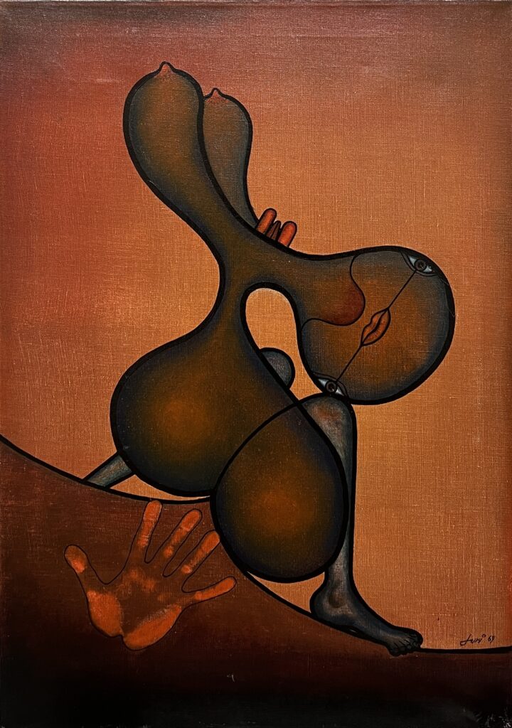 In this enigmatic study, an abstracted figure perches on an unseen ledge, its bulbous forms outlined in fine, dark contours against a warm sienna field. The gently tilted head and integral handprint suggest both presence and absence an exploration of memoryβs imprint on the body. Through its minimalist palette and sculptural lines, the work evokes a timeless tension between vulnerability and resilience, inviting viewers to contemplate the traces we leave behind.