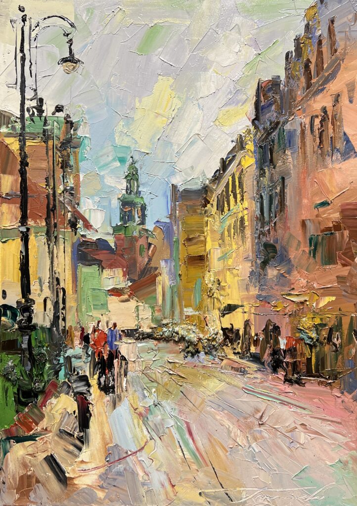 An exuberant dance of color and light unfolds within this textured streetscape, where the unrestrained brushstrokes breathe life into a bustling urban scene. The palette is a harmonious symphony of pastels and vivid tones, mingling with an impressionistic flair reminiscent of the spirited works of the late 19th century. Each stroke seems to capture the ephemeral nature of light, illuminating the façades and casting playful shadows along the cobblestones.