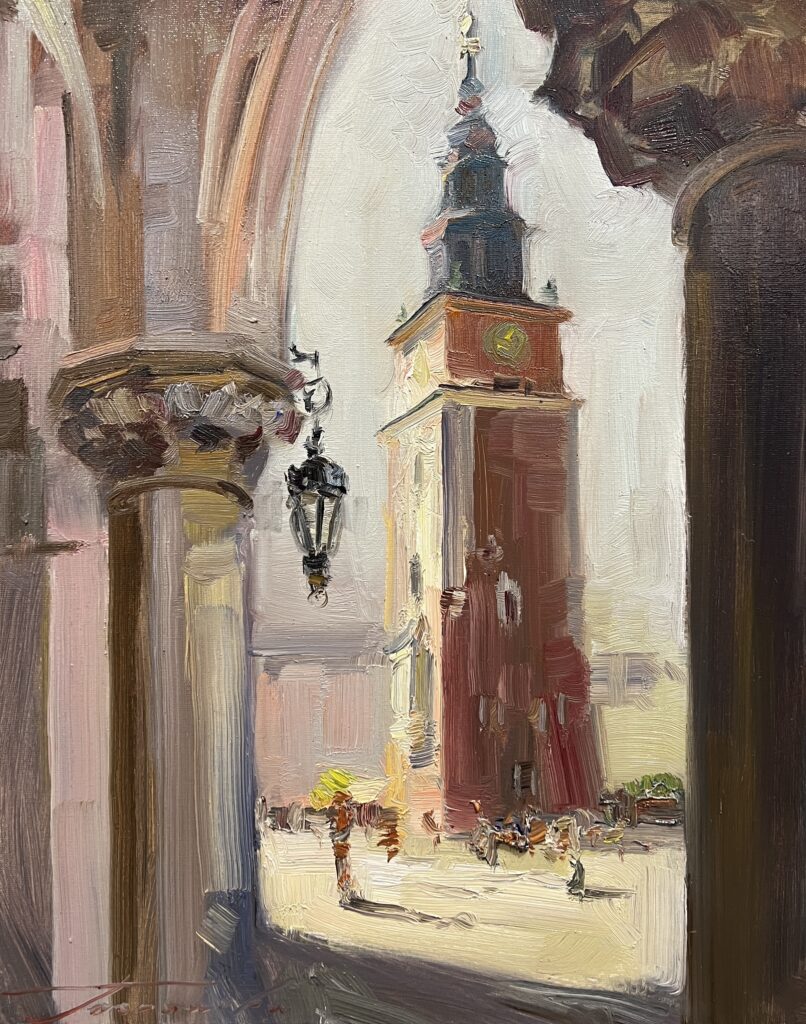 In a delightful dance of light and shadow, this evocative cityscape ushers us beneath grand arches, framing the scene with a baroque flourish. The brushstrokes, both bold and fluid, evoke the spontaneity of an impressionist's touch while capturing the structured elegance of a historic tower standing proudly at the composition's core. The warm hues of terracotta and gold contrast magnificently with the cooler blues and greys of the shadowed foreground, creating a harmonious yet dynamic narrative. The artist cleverly employs perspective to lead the eye through an alluring play of depth, while small figures at the tower's base hum with life, adding a touch of whimsy to this captivating urban tableau.